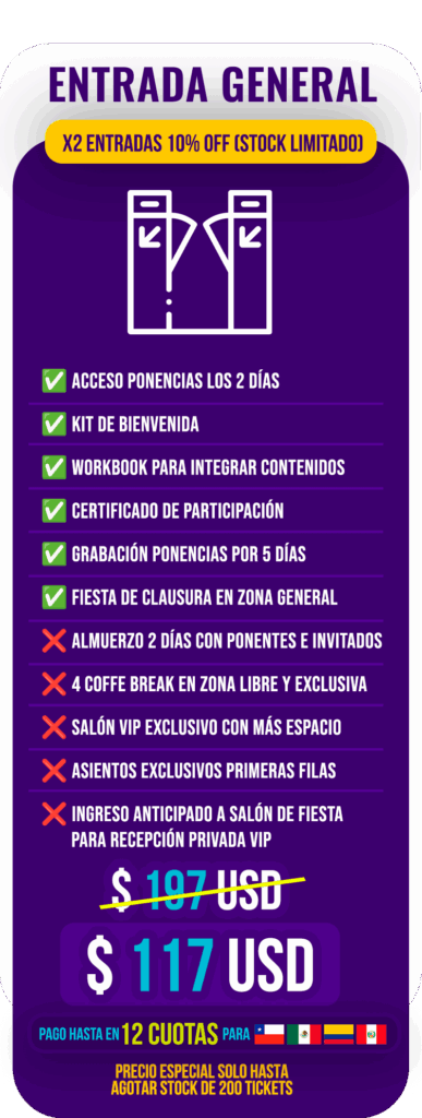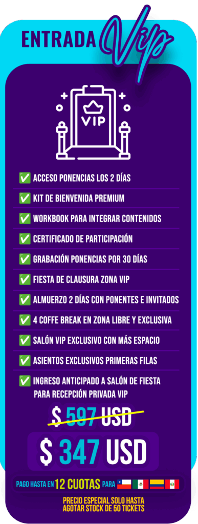 Conocerás las estrategias de Marketing y Venta más exitosas utilizadas en la industria. Tendrás la oportunidad de elegir y definir las que más te hagan sentido para que puedas adaptarlas y aplicarlas a tu Negocio de forma estratégica, considerando todo lo aprendido durante las ponencias y toda la cumbre. Crearás un plan para que logres integrar el contenido y tomar acción hacia tus resultados.